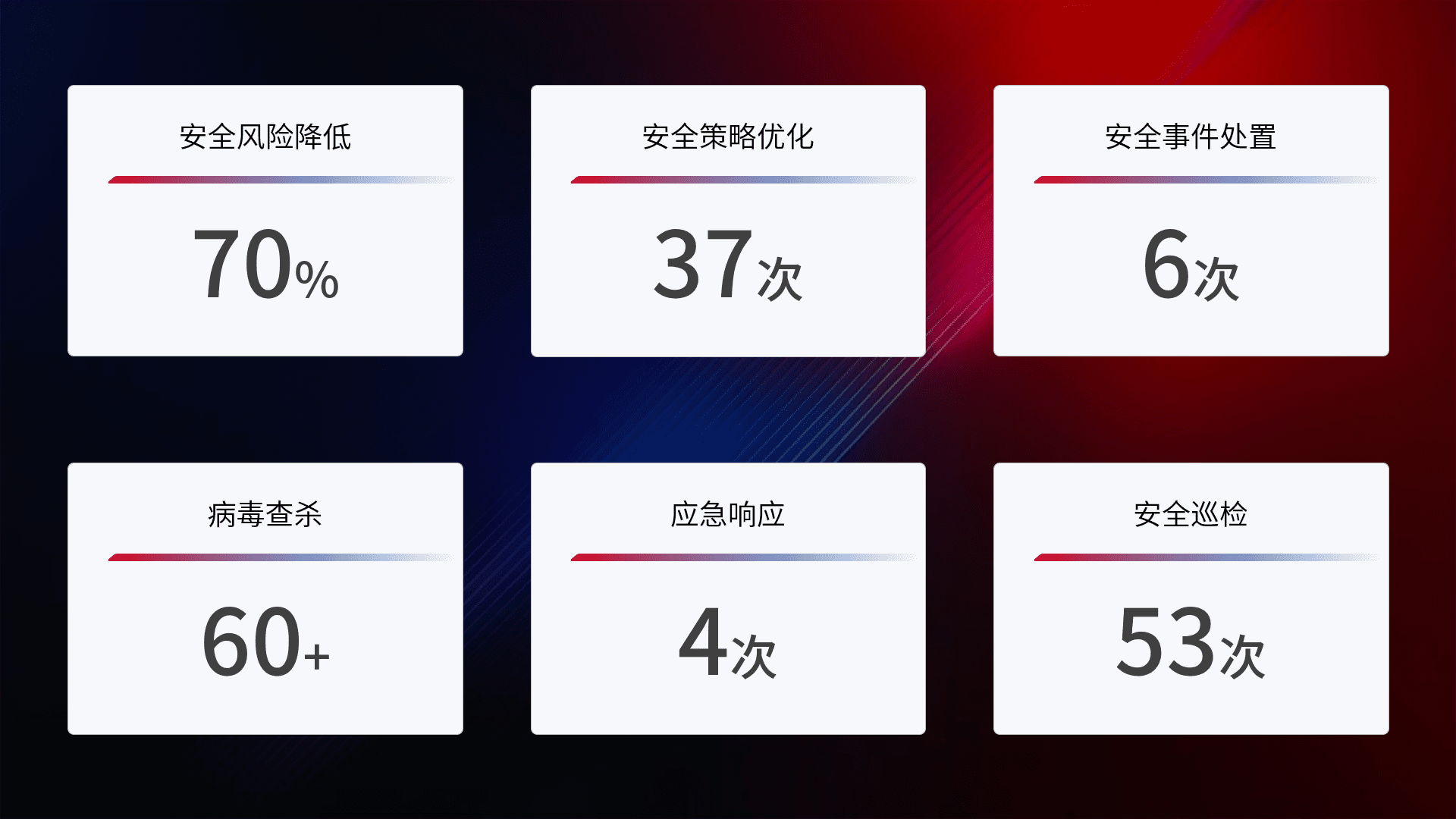 提供全面的安全事件报告体系,,,包括处置报告、、周报、、、季度和年度总结,,,,结合持续监控,,帮助客户深入了解网络安全状况。。。